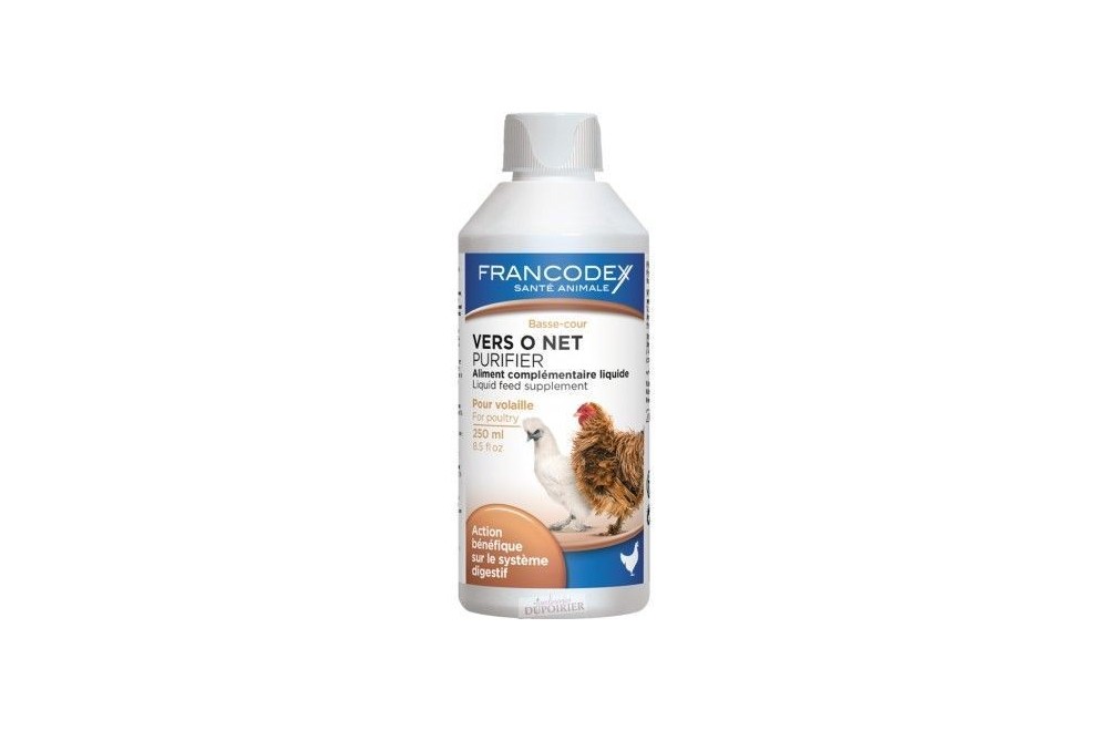Vers 0 net est un aliment complémentaire liquide, pour volaille, à base d'oligo-éléments et d'un mélange de substances aromatiques de plantes afin d'aider l'organisme à mieux réagir contre les agressions extérieures