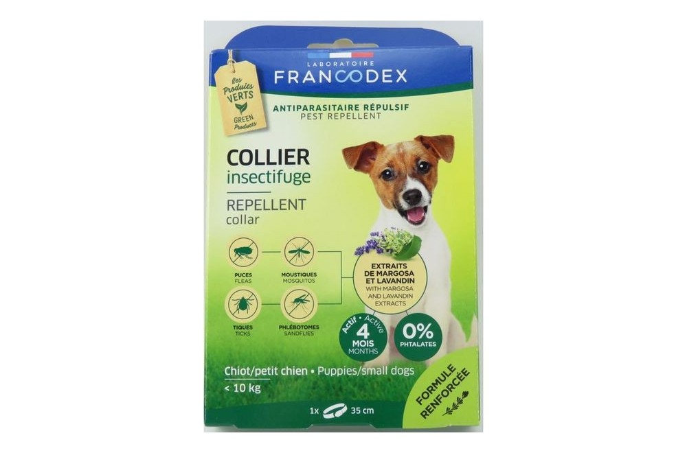 Collier antiparasitaire sans insecticides contre puces, tiques, moustiques et phlébotomes pour chiots et petits chiens de moins de 10 kg pour une durée de 4 mois de protection