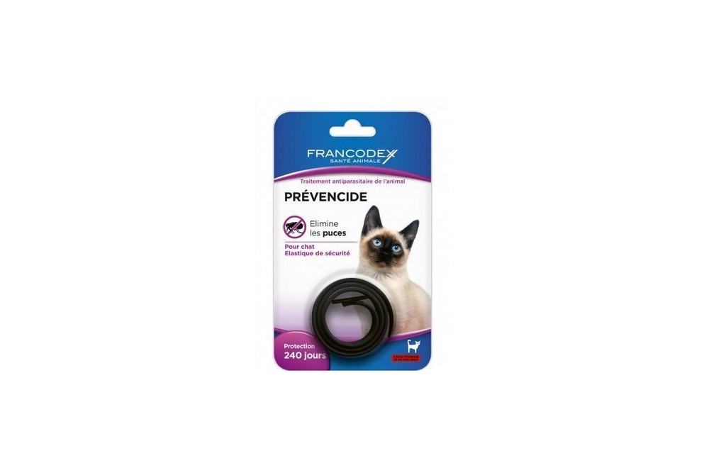 Collier pour chat prévent des infestations parasitaires durant 240 jours contre les puces et possède une trame plastique brevetée qui permet un relargage controlé et homogène de l'insecticide. Avec dispositif anti-étranglement