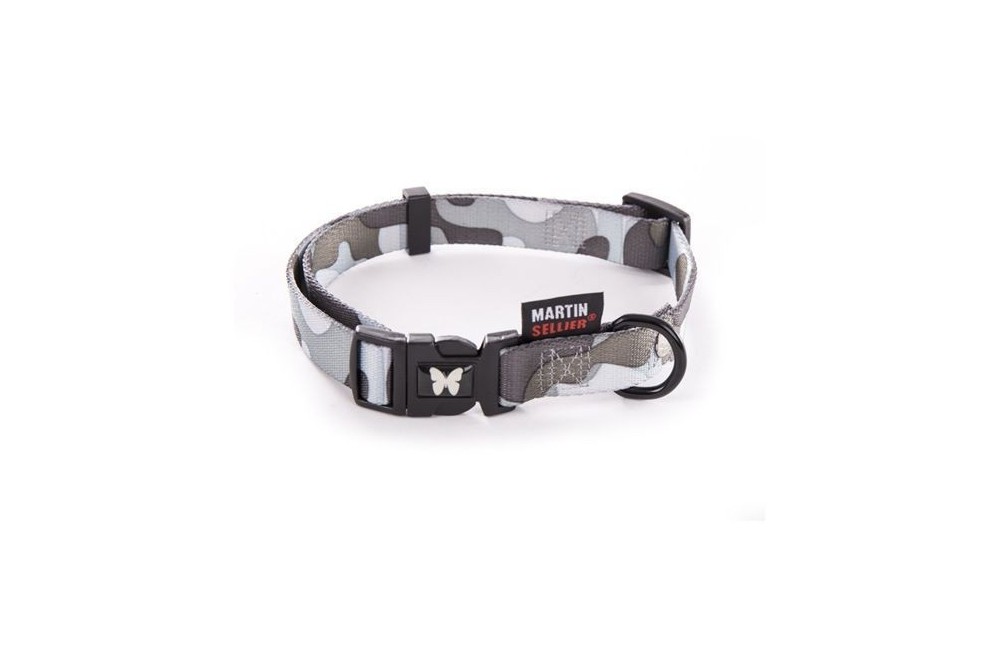 Collier nylon réglable, de largeur 1,5 cm, camouflage gris, accessoires laqués noirs, gamme pour moyen à très grand chien, boucle rapide