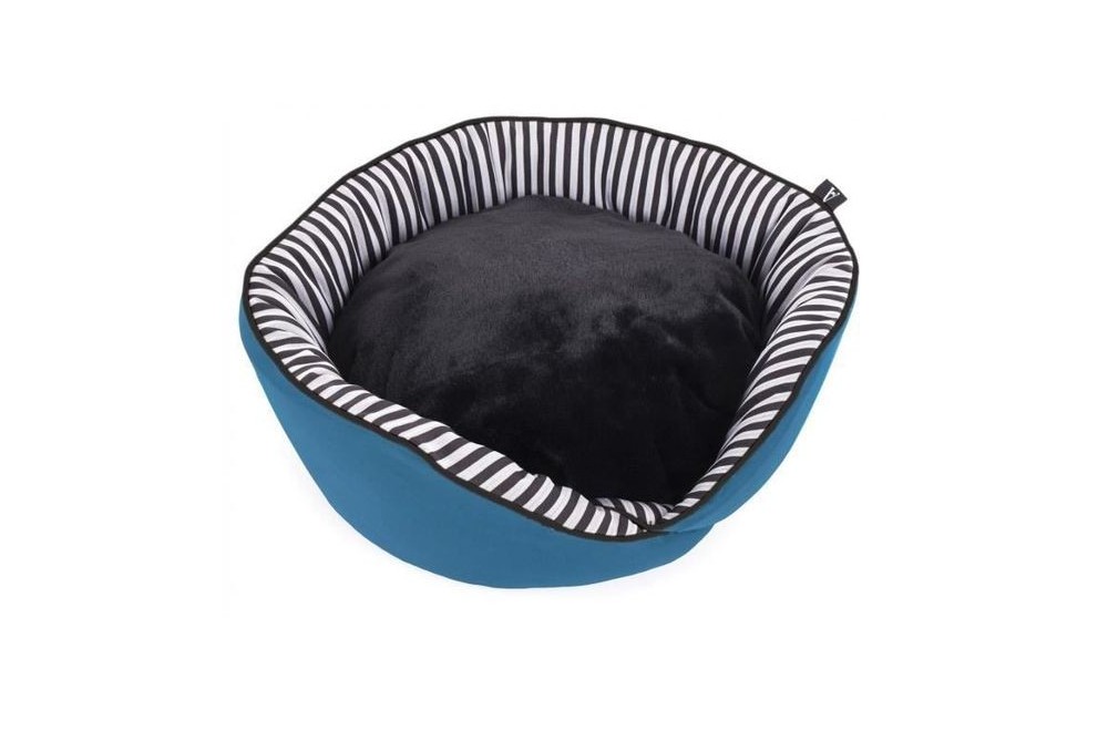 Corbeille ronde bleue, coussin amobible à deux faces, fourrure et rayures noire et blanche