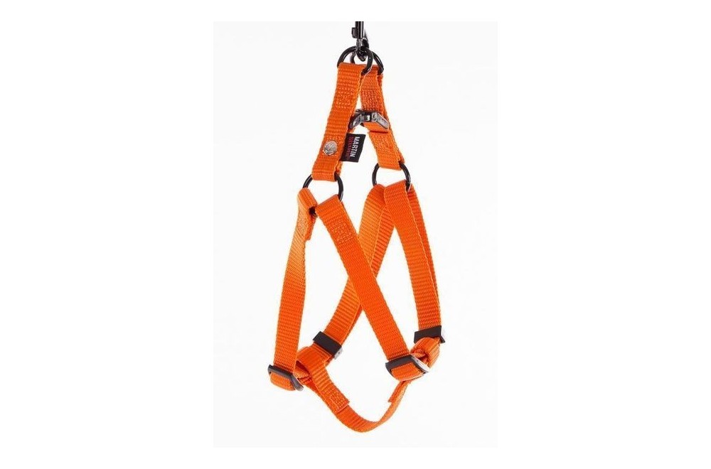 Harnais baudrier orange en nylon uni, simple d'utilisation, sécurité renforcée grâce à la double attache sur le mousqueton, taille 30 à 50 cm