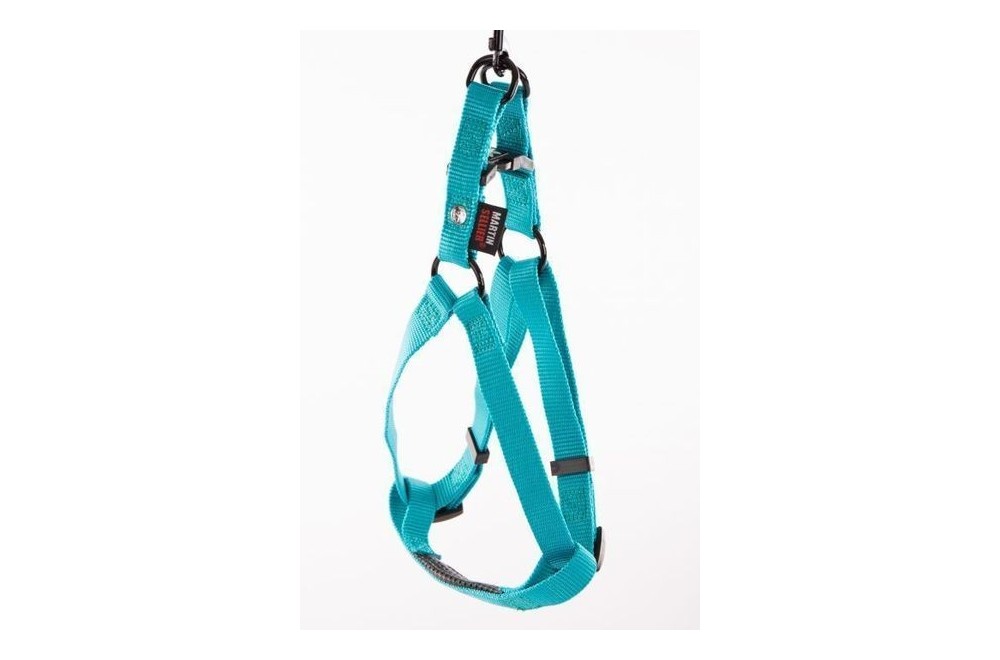Harnais baudrier turquoise nylon uni, simplicité d'utilisation, sécurité renforcée grâce à la double attache sur le mousqueton