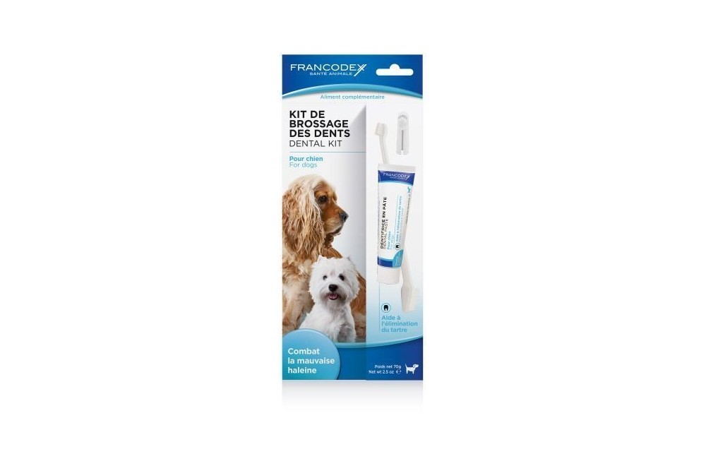 Kit de brossage comprenant un tube de dentifrice en pâte de 70 g une brosse à dents et 1 doigtier, aide à combattre l'accumulation de la plaque dentaire et la formation du tartre. Utilisation facile grâce à la brosse à dents ergonomique et au doigtier, rafraîchit l'haleine et neutralise les odeurs du tube digestif
