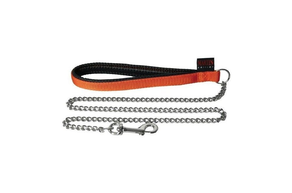Laisse composée d'une chaîne forte et d'une poignée en nylon orange avec mousqueton carabine et poignée confort, largeur 2,5 cm pour une longeur de 1 m