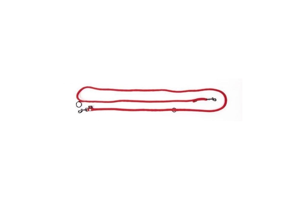 Laisse multiposition ronde de diamètre 9 mm en nylon uni rouge, 3 longueurs de laisse réglable et 3 utilisations : laisse 115 à 190 cm, laisse 2 chiens, laisse autour du maître ou autour d'un poteau, mousqueton attache rapide