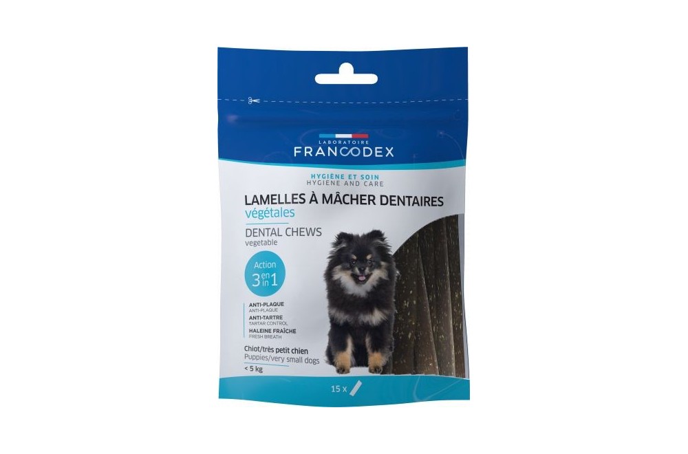 Lamelles à mâcher dentaires végétales pour chiots et petits chiens, contribuent à réduire la plaque dentaire et de tartre, et à maintenir une haleine fraîche. Leur forme en Z et leur texture abrasive ont été étudiées pour apporter un nettoyage mécanique efficace des dents