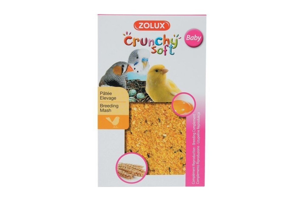 Pâtée d'élevage pour oiseaux domestiques. Cette pâtée vient en complément ponctuel de la ration quotidienne de graines, Crunchy Soft Baby est indispensable en phase critique de ponte, croissance et mue. Boîte en carton avec sachet fraîcheur azoté transparent évitant ainsi l'intusion des insectes et préservant la qualité et la fraîcheur des ingrédients. Composition : Céréales (42,5%), Produits de boulangerie, Huiles et graisses, Sous-produits d'origine végétale, Sucres, Minéraux, Graines, Oeufs et produits d'oeufs (0,1%), Lait et produits de laiterie, Additifs: Colorants, Anti-oxydants, Vitamines & Acides aminés*. Constituants analytiques : Protéine brute 10. 98%, Matière Grasse 16. 22%, Cendre brute 5. 96%, Cellulose 2. 29%, Humidité 10. 82%. Vit A 5600 U. I. /Kg, Vit D3 560 U. I. /Kg, Vit E/all-rac-alpha-tocopheryl acetate 5. 6 mg/Kg, Vit C 4 mg/Kg, DL-Methionine 400 mg/Kg, L-Lysine 200 mg/Kg. E102 2100 mg/kg, Sodium propionate E281 2650 mg/kg, BHT E321 400 mg/kg.