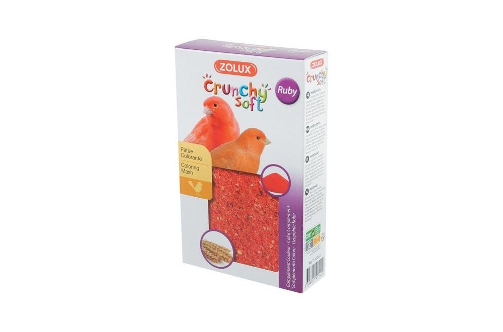 Aliment complémentaire pour canaris, la pâtée colorante Crunchy Soft Ruby contient du bêta-carotène et contribue donc à renforcer la pigmentation des Canaris rouges. Boîte en carton avec sachet fraîcheur azoté transparent évitant l'intusion des insectes et préservant la qualité et la fraîcheur des ingrédients. Composition : Céréales (39,4%), Produits de boulangerie, Huiles et graisses, Sous-produits d'origine végétale, Sucres, Graines, Minéraux, Lait et produits de laiterie, Oeufs et produits d'oeufs, Additifs: Colorants (dont Carotene 30 mg/Kg), Anti-oxydants, Vitamines & Acides aminés*. Constituants analytiques : Protéine brute 9. 66%, Matière Grasse 17. 42%, Cendre brute 1. 98%, Cellulose 2. 09%, Humidité 10. 94%. Carotene 30 mg/Kg, Vit A 5000 U. I. /Kg, Vit D3 500 U. I. /Kg, Vit E/all-rac-alpha-tocopheryl acetate 6. 9 mg/Kg, Vit C 4 mg/Kg, DL-Methionine 380 mg/Kg, L-Lysine 200 mg/Kg. E124 1100 mg/kg, Sodium propionate E281 2620 mg/kg, BHT E321 400 mg/kg.