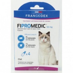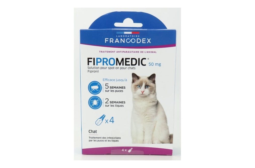 Boite de 4 pipettes antiparasitaire de 0,5 ml Fipromedic 50 mg pour chat de plus de 2 mois et/ou plus de 1 kg , jusqu'à 5 semaines de protection contre les puces et 2 semaines contre les tics