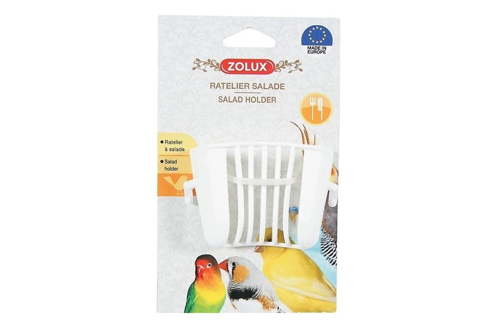 Ratelier à salade blanc, ses crochets lui permettent de se clipser sur la cage.