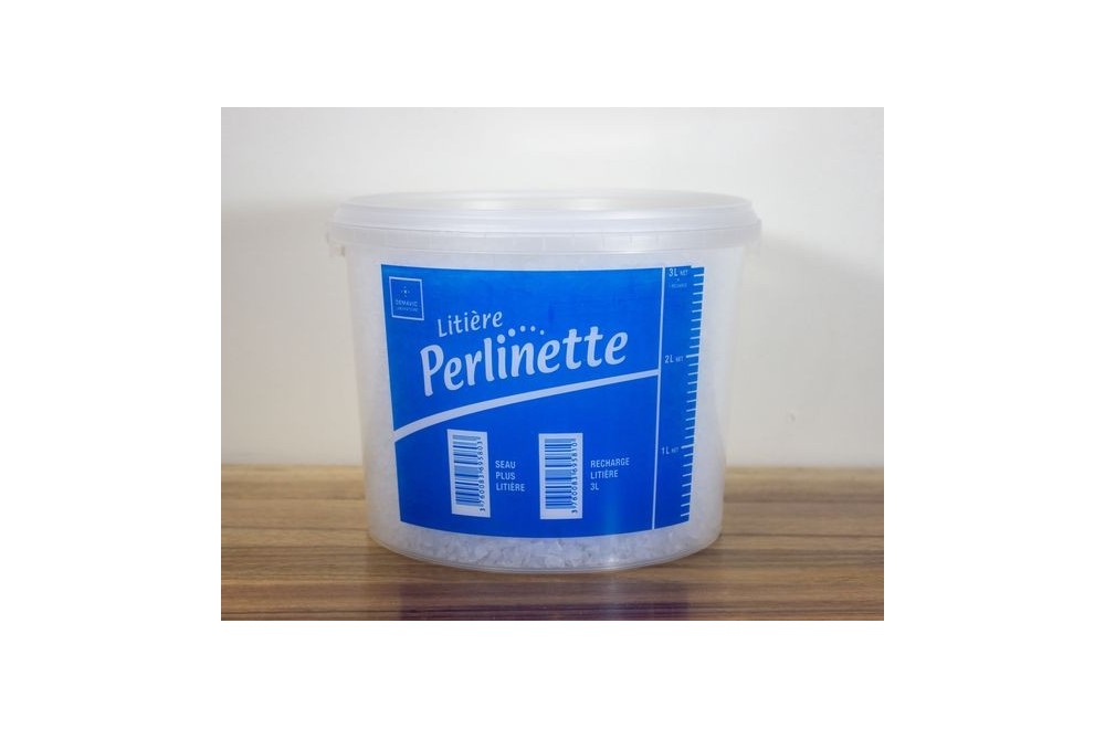 Seau plus litière Perlinette de 3 L en silice 100 % naturelle, ultra-absorbante permet un entretien facile et rapide, sans odeur.