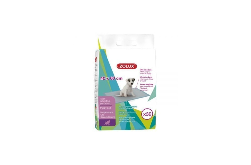 Lot de 30 tapis d'éducation chiot pour l'appentissage de la propreté. Ultra absorbant. Dimensions L60xp40cm (retient jusqu’à 250ml d’humidité)