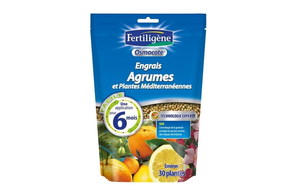 Engrais agrumes et plantes méditerranéennes, Formule parfaitement adaptée aux agrumes et plantes méditerranéennes pour une bonne adaptation et une floraison abondante, Une seule application pour toute la saison! Nom homologué : Engrais osmocote NPK 16-09-10, AMM : Engrais CE, NPK (Mg) 16-09-10 (2) de mélange, contenant des oligo-éléments