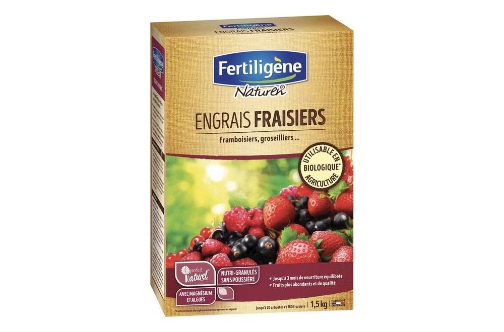Engrais idéal pour tous les plants de fraisiers et arbustes à petits fruits : framboisiers, groseilliers, cassissiers, mûriers...