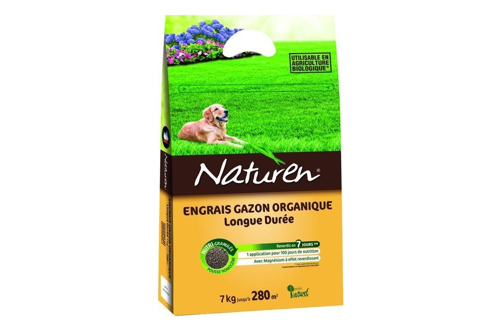 NATUREN ENGRAIS GAZON ORGANIQUE 7 KG 280 m² - 7 KG, L’engrais gazon s’applique sur tous types de gazon, Il assure un reverdissement en 7 jours, Formule efficace qui assure un reverdissement en 7 jours, Rend le gazon plus dense et plus robuste, Azote 100% organique : action naturellement progressive, 1 application pour 100 jours de nutrition, Les chiens et chats peuvent revenir après application, Limite les risques de lessivage, Utilisable en agriculture biologique*, ENGRAIS NF U 42-001, NPK (Mg) (Ca) 9-2-2 (3) (6)