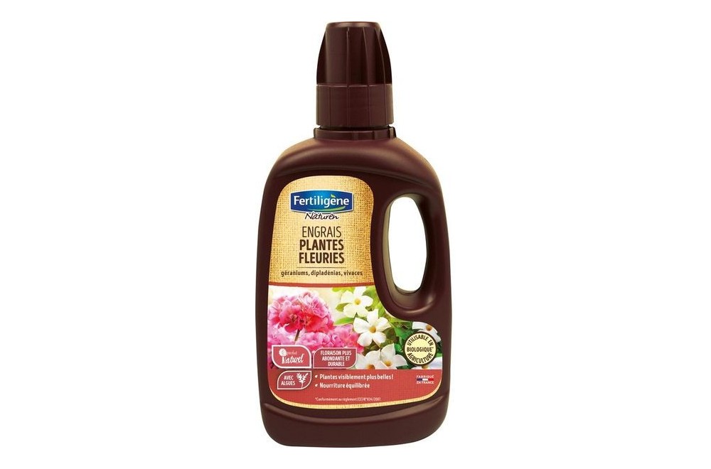 L'engrais liquide plantes fleuries Fertiligène Naturen est formulé à base d'algues marines et apporte une nourriture complète aux plantes (dahlias, géraniums, dipladénias, pétunias, surfinias...)pour garantir la croissance et une floraison plus abondante et durable. Pour des plantes fleuries visiblement plus belles ! Utilisable en agriculture biologique*.