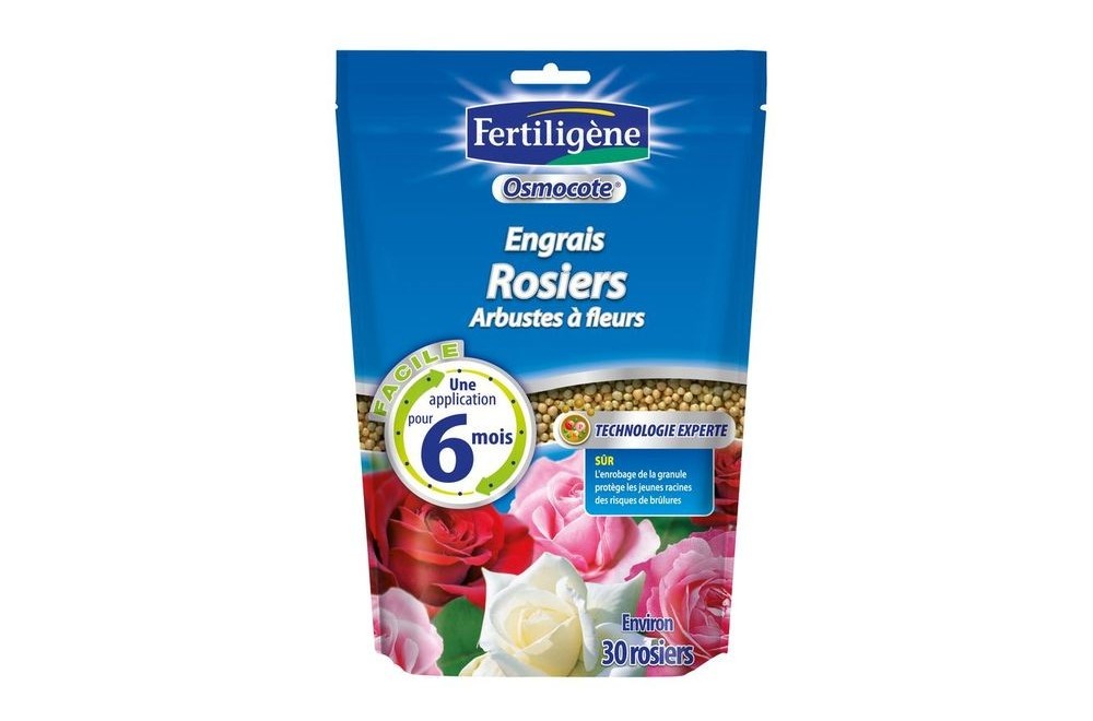 Engrais osmocote rosiers, arbustes à fleurs doypack de 750g, Engrais rosiers, arbustes à fleurs, Formule parfaitement adaptée aux exigences et rythme de vie des rosiers et arbustes à fleurs, Une seule application pour toute la saison! Nom homologué : Engrais osmocote NPK 17-09-11, AMM : Engrais CE, NPK 17-09-11 avec oligo-éléments,